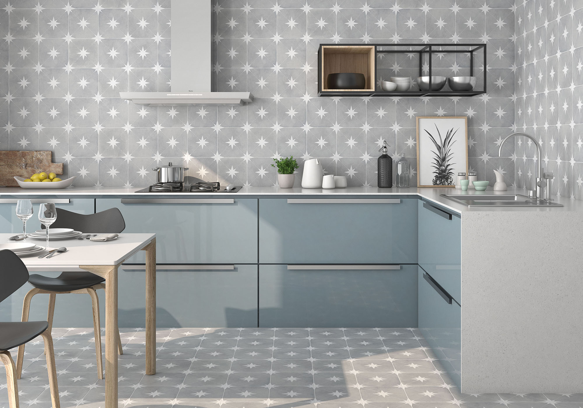 Barcelona is a 223mm x 223mm patterned porcelain feature tile available in Azur, Grigio and Nero. Designed to bring Mediterranean character to kitchens, bathrooms and feature floors, this durable porcelain tile is suitable for both walls and floors. 20 tiles per m². £45.48 per m² inc VAT.